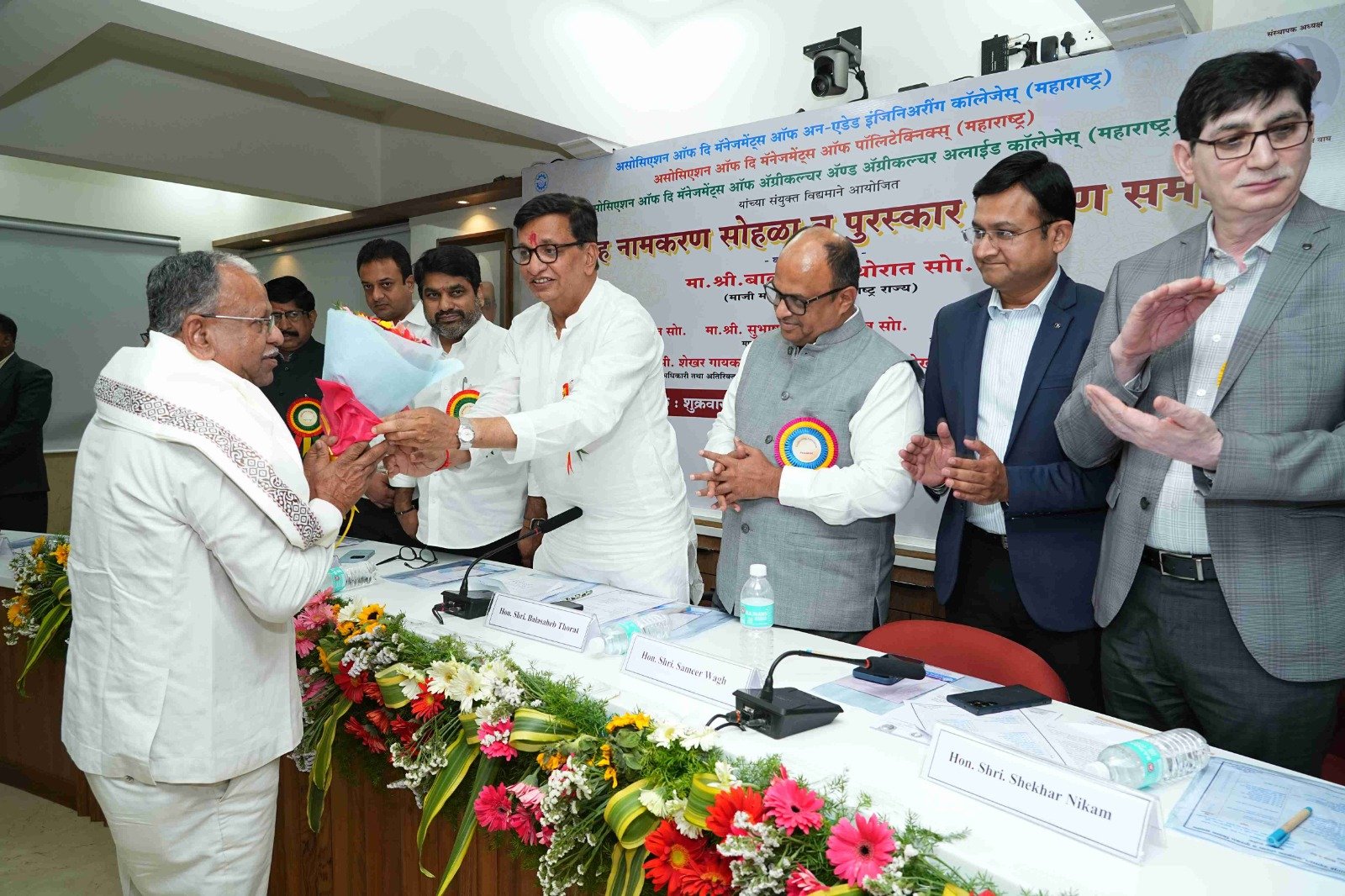 Felicitation of Mr. Nilesh Wadekar by the former revenue minister of Maharashtra State Hon. Mr. Balasaheb Thorat in the presence of the Former Minister of State for Home Affairs of Maharashtra State Hon. Mr. Satej (Bunty) Patil, Retired Chartered Officer and Additional Director General, Yashda, Pune. Mr. Shekhar Gaikwad, President of the Association Hon. Mr. Sameer Balasaheb Wagh and other dignitaries