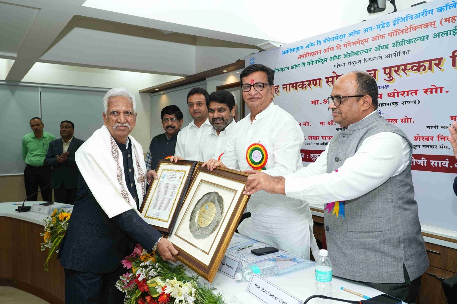 On behalf of the Polytechnic Association, President of Sanjeevani Rural Educational Society, Kopargaon, Hon. Mr. Nitin Shankarao Kolhe is awarded with “Hon.Shri. Balasaheb Wagh (Bhau) Memorial Life Time Achievement Award” by the former Revenue Minister of Maharashtra State Mr. Shri. Balasaheb Thorat in the presence of the former Minister of State for Home Affairs of Maharashtra State Hon. Mr. Mr. Satej (Bunty) Patil, President of the Association. Mr. Sameer Balasaheb Wagh, Treasurer Hon. Mr. Amit N. Kole and other dignitaries