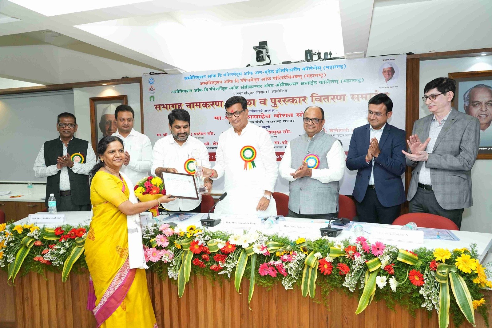 On behalf of Engineering Association'Dr. PN Kulkarni Memorial Award for Best Teacher' awarded to Dr. Mrs. Pratibha Kaladeep of the Walchand Institute of Technology, Solapur with the auspicious hands of the former Revenue Minister of Maharashtra State Hon. Mr. Balasaheb Thorat in the presence of former Minister of State for Home Hon. Mr. Satej (Bunty) Patil, the President of the Association Hon. Mr. Sameer Balasaheb Wagh, Treasurer Hon. Mr. Amit N. Kolhe, General Secretary Hon. Dr. Anil Kumar S. Gupta and other dignitaries